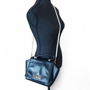 Kate Spade Black Leather Mini Flap Bag – Bow Turn-Lock Closure, Faux Pearl Chain