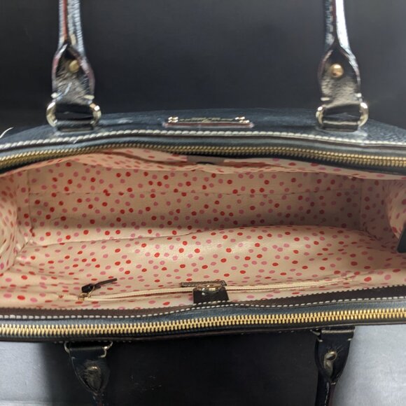 There are 2 large zippered sections. Interior is cure polka dot pattern.