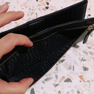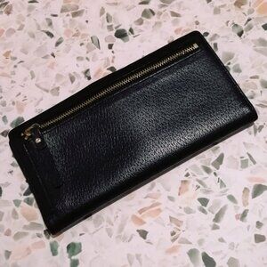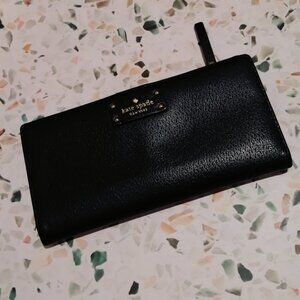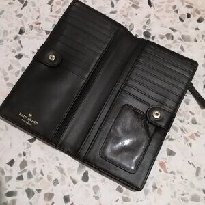 This listing is for a black leather wallet made by Kate Spade. Its style number is WLRU2817. This wallet features a long, slim design with a snap closure. It has a zipper pocket on the back, 4 slip pockets inside, and 20 card slots (including one with ID window). The fabric lining is tone-on-tone black Kate Spade New York monogram. The name and spade logo can be seen in gold on the inside and pinmounted on the outside front. The zipper pull on the back a stamped spade logo. All hardware is gold toned. There's slight wear on some of the hardware and interior logo; all leather is clean and in great condition. A beautiful wallet over all; EUC.