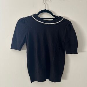 Black Kate spade short sleeved sweater. It has a black tie back and is embellished with pearls.