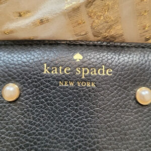 This is a chic Kate Spade New York wallet in black leather, adorned with elegant pearl embellishments. Compact in size (approximately 7″ long × 4″ high × 1″ wide), it’s both refined and practical. The wallet remains in very good condition, though some wear is visible at the interior corners—evident in the photos.