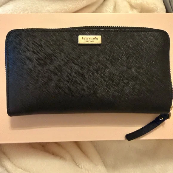 Chic black wallet by Kate Spade. Features a textured finish and zip closure.