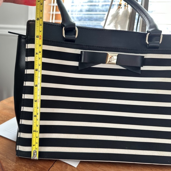Kate Spade Black and White Leather, Shoulder Medium Satchel, Bow in front with Logo, pocket front, plus division inside.