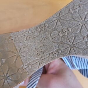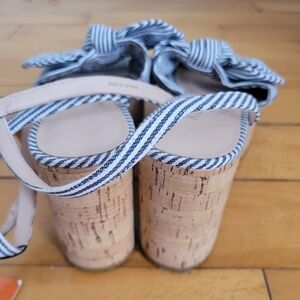 These Kate Spade striped fabric bow wedge sandals, size 6.5 (EU 37), are in excellent condition, barely worn. Featuring striped fabric straps with oversized bows and a sturdy wedge heel of approximately 3.5 inches (~9 cm), they capture the playful elegance Kate Spade is known for.