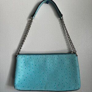 Kate Spade Blue Wellesley Ostrich Clutch with silver-tone chain and zipper. In good used condition with some scuffing on corners.