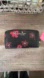 Black background with two tone burgundy floral pattern. Gold zipper.