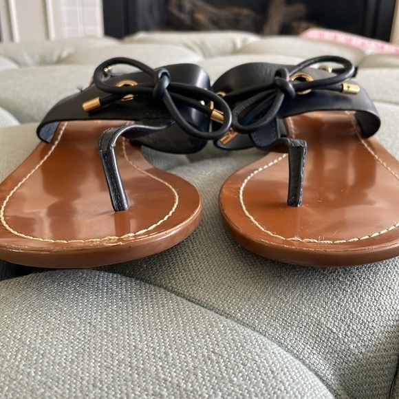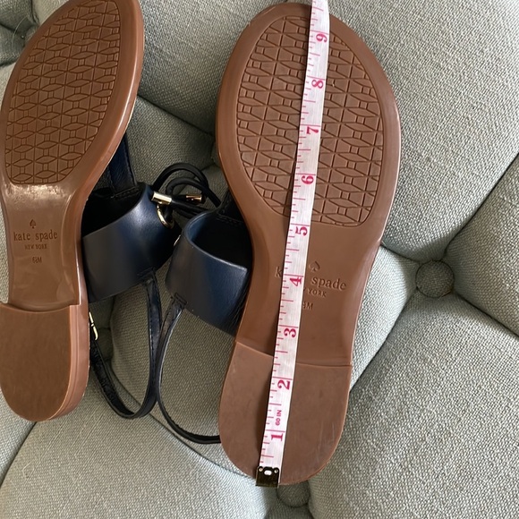 Kate Spade Carolina leather thong sandals in navy blue.ankle strap with buckle closure, leather lace bow detail with gold toned hardware/ accents, rubber outsole. Size 6 1/2 M. Excellent like new condition with minimal wear to outsole. Please see photos, measurements are for reference only. Reasonable offers welcome!