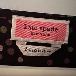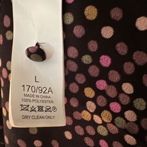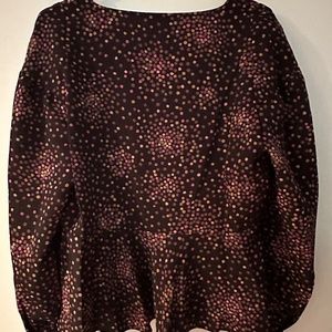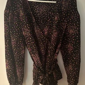 A multicolor dotted print adorns this faux wrap top with fluttering peplum hem.