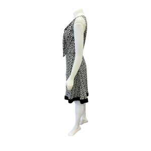 Bird print dress black and white has a slip side zipper closure sleeveless elastic waist asymmetrical tie on neck line bottom flares out