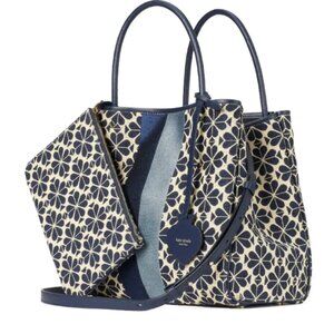 Kate Spade Everything Tote Large Flower Jacquard Stripe Blue Wristlet Adjustable