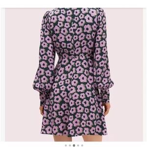 Kate Spade Faire Flower Dress in excellent used condition. Deep green and purple floral design with long puff sleeves, four buttons at each cuff. Scoop neckline and eight buttons at front, centre. Two side pockets. Measures 35 inches from shoulder to hem. Size 2.