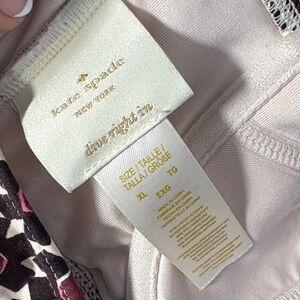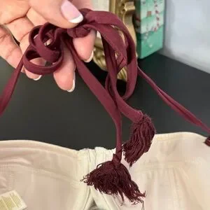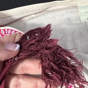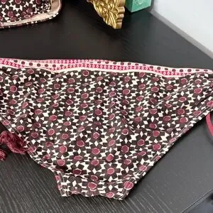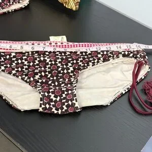 Stylish bikini set with a geometric pattern. Features a mix of red, cream, and black colors. Perfect for a chic beach look. Excellent used condition. See photos for measurements.