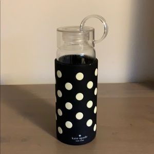 VGUC Kate Spade black and white polka dot glass water bottle with acrylic top and protective silicone sleeve.