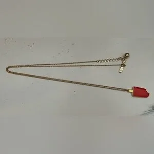 Kate Spade gold-coloured long chain necklace with coral coloured enamel popsicle charm. Long and adjustable chain with lobster clasp. Approximately 34” from end to end. Whimsical and fun piece that can be worn on its own or layered for a boho chic look!