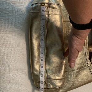 Gorgeous! Leather gold/metallic hobo style bag with arm strap. Zipper closure. Front emblem/pocket - still has protective film. No damage/wear seen on exterior. Interior is white with black polka dots. Small side zipper pocket and interior has reddish stain. Minor dirt/wear along interior zipper - could be cleaned but didn’t want to touch it. Otherwise very clean and in excellent condition. See photos for measurements and details.
