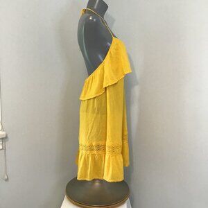 Vibrant golden yellow halter dress with tiered ruffles and lace trim, The dress has a loose, flowing fit and a bright, summery appearance.. The style is reminiscent of a bohemian or vintage aesthetic, with the ruffles and lace adding a touch of femininity. The dress is quite sheer so it would require a slip , or it could be worn as a cover up.