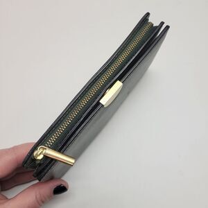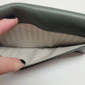 Elegant green wallet. Sleek design. Gold zipper accent.