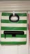 Stylish green and white striped tote bag with a convenient front zipper pocket.