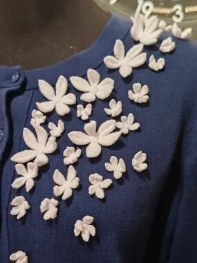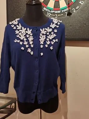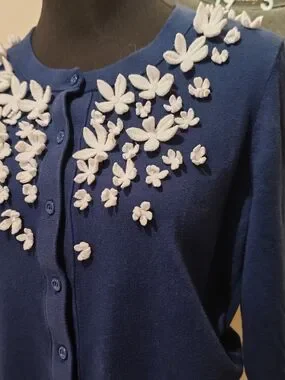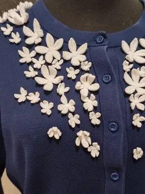 This is a Kate Spade In Full Bloom Cardigan, a stylish and gently worn piece featuring charming floral embellishments, perfect for adding a touch of elegance to any outfit. This beautiful cardigan is in good condition and ready to be worn and enjoyed!