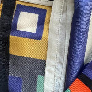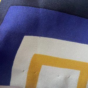 Colours: Orange, gold, brown, royal blue, white and jade on a navy blue background. Will go with so many different colored tops and sweaters!