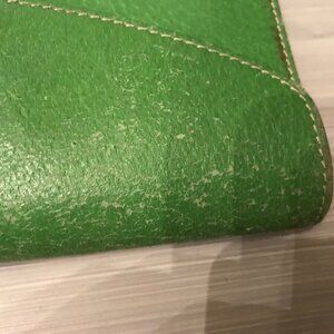 The Kate Spade Wallet Abby is a stylish wallet designed for women. Made from high-quality leather in a vibrant green color, this wallet features multiple credit card slots, an organizer section, and a checkbook compartment for convenient storage of essential items. With its sleek design and practical features, this wallet is perfect for everyday use and adding a pop of color to any outfit. The wallet measures 7.5" x 4". Good condition slight scuff marks on the front (see close up photo).