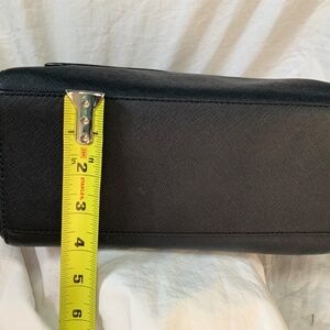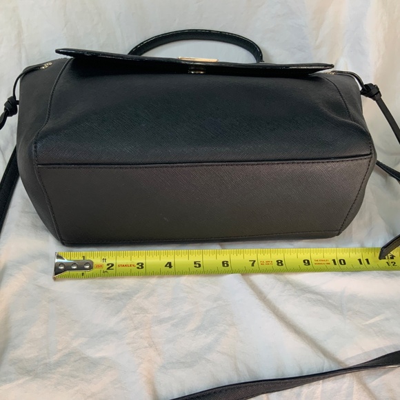 This bag is in excellent, clean condition., with one exception. The only flaw is in the handle, as you can see in the last photo. This would only be a problem if you wanted to carry it by the handle, rather than use the crossbody strap. It isn’t very noticeable, and I have lowered the price considerably because of it. You can see that otherwise the bag looks good, with just some minor wear to the hardware. It is a quite a structured bag, and the polyurethane coating on the leather makes it quite durable and easy to clean.