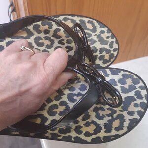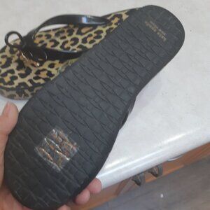 Man made upper and sole - Black patent look strap and bow with gold tip and gold charm - Slip on style - Heel: 1.75" Wedge front 1"; Rhett round open-toe slip-on thong platform wedge flip-flop sandals with bow detail; In good condition except a smear on the footbed by the strap on both shoes (see pics 3 and 4); Not noticeable when wearing them. Otherwise, no holes or scrapes.
