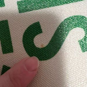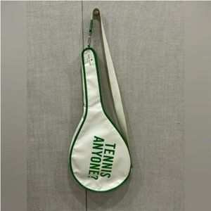 White and green coated canvas with saying "Tennis Anyone?"