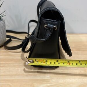 Chic black crossbody with scalloped edges. Features a gold-tone clasp. Ideal for versatile styling.