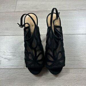 Peep-toe Kate Spade New York mesh sandals gain graphic appeal with suede trim flowing into soft petals. A buckle secures the slingback strap. Covered heel and leather sole.