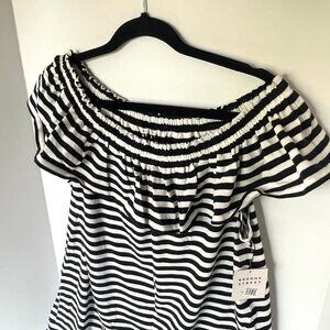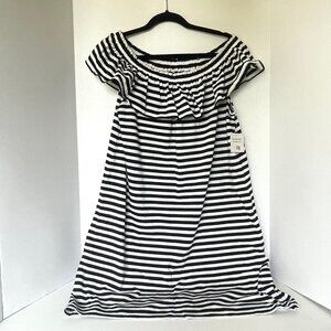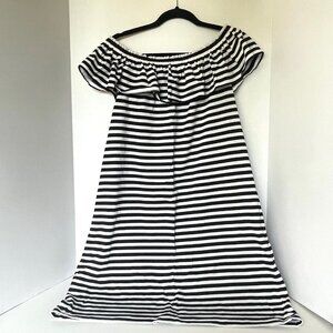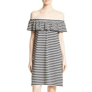 Kate Spade Mini Dress Off Shoulder Black Stripe Shift Cotton A-Line Ruffle