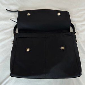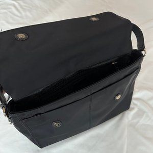 This black nylon messenger bag with gold hardware is in nearly perfect condition.