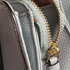 Features: Lovely blue-grey crossbody/shoulder bag with removable straps. Pebbled leather, front and back magnetic enclosures with zipper middle enclosure.