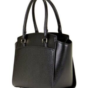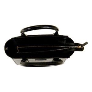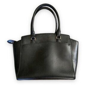 Classic black leather satchel style handbag It is 10" tall, 6" deep and 11" wide Attached handles have a 6" drop to the top of the bag Removable shoulder strap is 43" in length in the middle hole and can be lengthened or shortened 3". Outside is a large