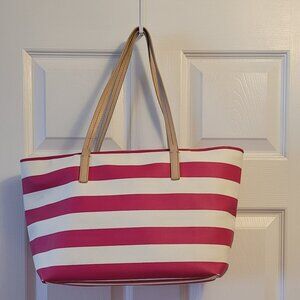 A bold, graphic pattern and slim handles are the perfect one-two punch for the minimalist-approach medium tote from kate spade new york. Rose pink and white stripe with tan leather handles.