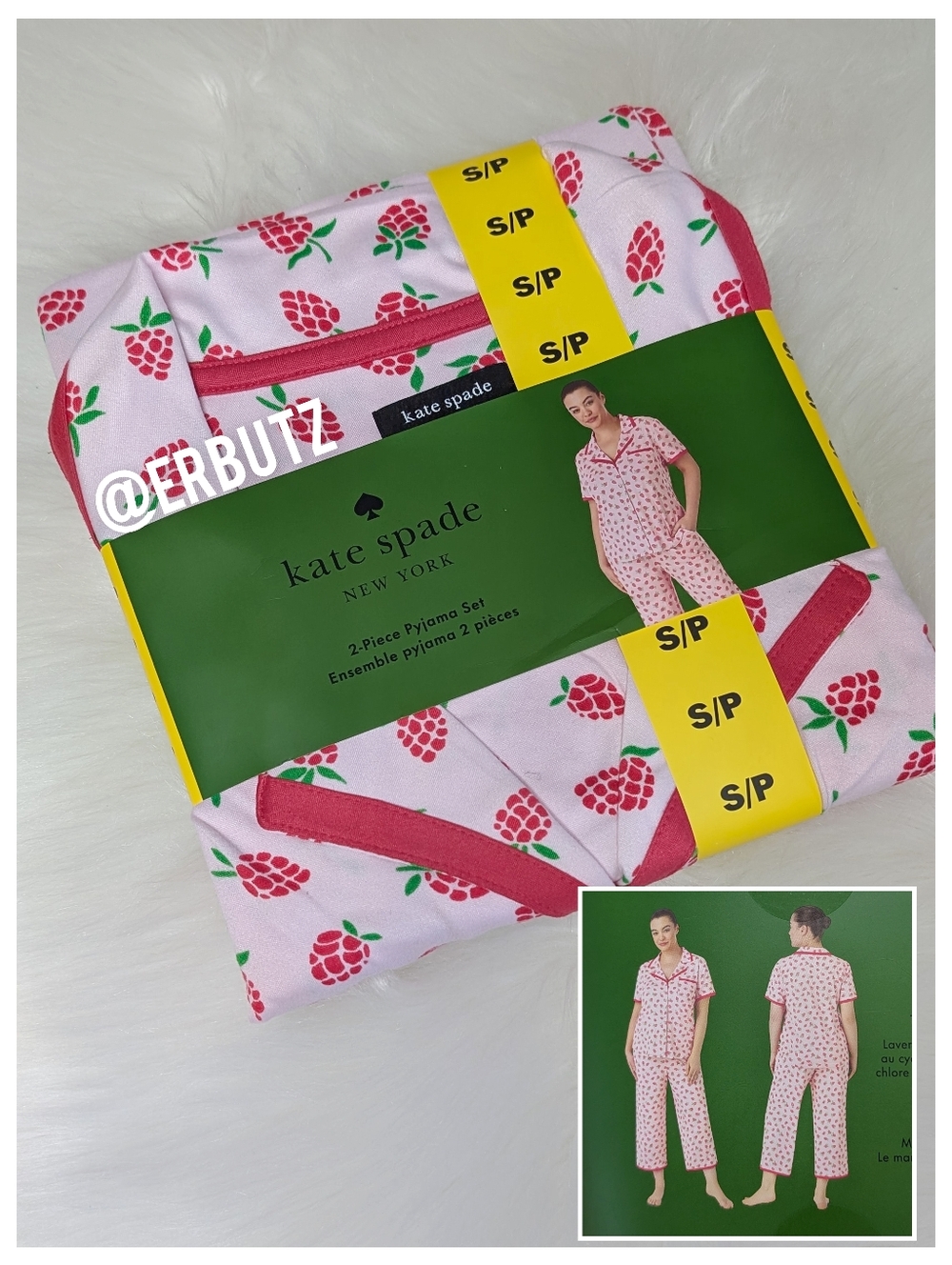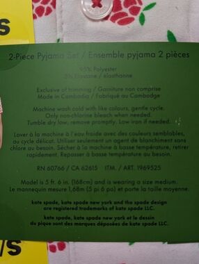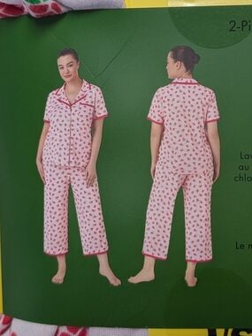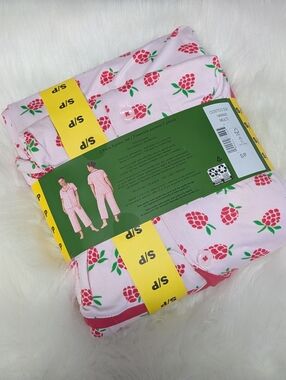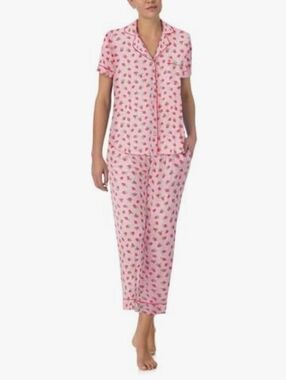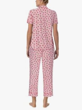 Sweet and feminine, this Kate Spade pajama set features a soft pink base with chic raspberry prints throughout . The classic button-up collared top pairs perfectly with cropped pants, complete with an elastic waistband and adjustable drawstring for all-night comfort. 🩷