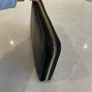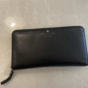 Super soft leather, a bit worn but no scratches or real marks, just a few 'dimples' on back and the Kate Spade New York words are a bit faded but you can still see them. Inside in great shape, very clean no markings. Zippers work perfectly super smooth. Dimensions: 8" long x 4" high. A great every day wallet holds a TON of stuff yet still very light and so soft and supple. The leather has worn beautifully and only gets better with more use. Bought it directly from the Kate Spade store in Toronto.