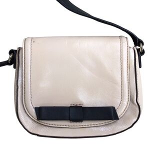Trendy Chelsea Park light pink patent leather small crossbody bag with a sleek black leather bow, gold hardware, white with black bow designed fabric interior, flap closure with magnetic snap, interior slip pocket and adjustable black strap.