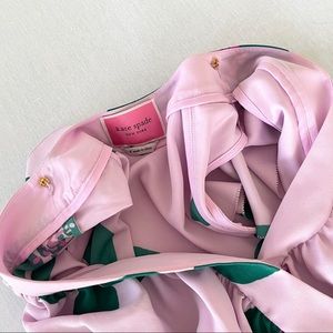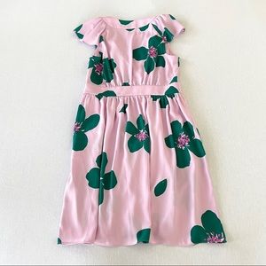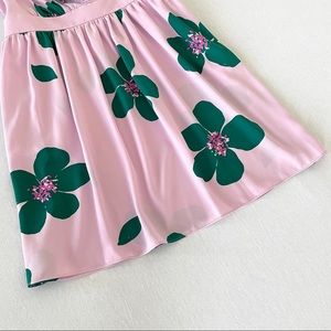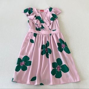 Chic mini dress with ruffle details. Features bold green floral pattern on a pink background. Perfect for any occasion.