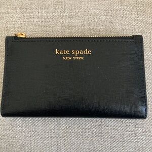 Purse has 3 options to use: the gold chain, black strap, or use as a clutch. The wallet has 6 card slots and a zippered section.