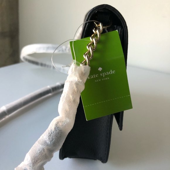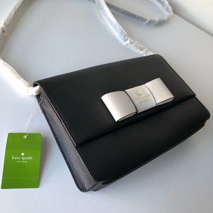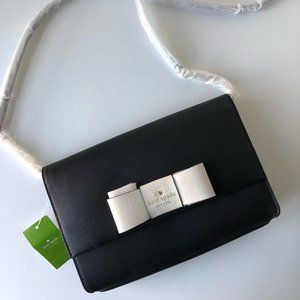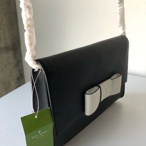 Brand new, never worn Kate Spade leather handbag with original tags. Black leather purse with white bow detail and gold accents. Can be worn as a crossbody bag or a clutch.