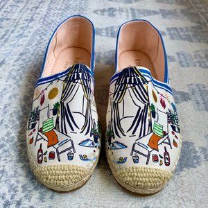 Super cute Kate Spade espadrilles in Rooftop design, size 9US, 38.5EU. Very fun rooftop patio design with glitter and rhinestones. Only tried on, never worn, in excellent condition. Cotton blend canvas with twill lining and classic espadrille jute midsole with rubber sole for grip. Cat friendly, nonsmoking home.