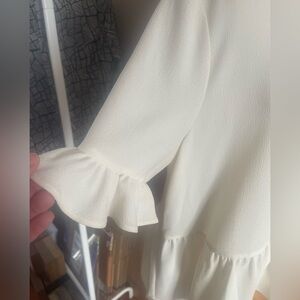 Chic cream blouse with ruffle sleeves and peplum. Perfect for versatile styling.
