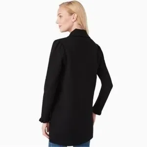Heaven weight long sweater. Called a blazer, but it’s definitely more of a heavy knit open cardigan. Has a single button at neck, and pockets at hips.subtle cute ruffle trim on hems and collar.