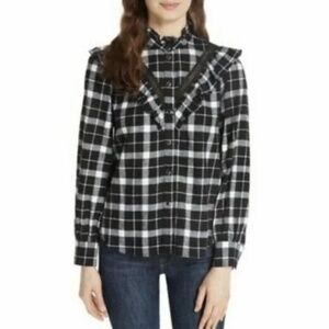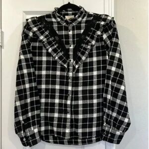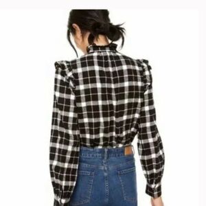 But with a cute ruffle detail on the collar and shoulders, plaid flannel snap front shirt with dramatic ruffle at yoke and shoulder