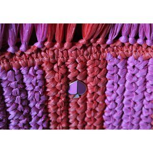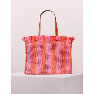 Two-tone straw brings a fresh and summery update to a signature Kate Spade tote elevated with playful fringe lining the top. A roomy interior with plenty of pockets provides space for easy, everyday organization. - Lobster clasp top closure - Exterior features striped raffia construction with frayed top trim - Fabric lined interior with 1 slip and 1 zip pockets.