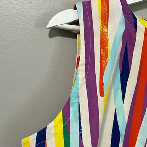 Excellent condition. Rare. Vibrant coloured vertical striped pattern. Full metal snap sides. Keyhole snap closure back. Straight hem, slightly longer in back.