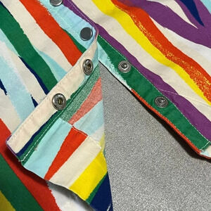 Excellent condition. Rare. Vibrant coloured vertical striped pattern. Full metal snap sides. Keyhole snap closure back. Straight hem, slightly longer in back.