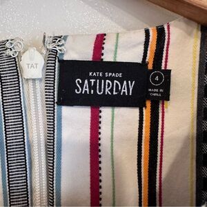 In very good condition. Kate Spade Saturday cotton sleeveless dress with a full skirt. Multicolour, multidirectional stripes throughout the dress with a high rounded neckline. Side pockets and back zipper closure. There is one very small spot near the collar but otherwise in excellent condition. Flat lay measurements: 15" pit to pit, 14" waist, 33.5" length.