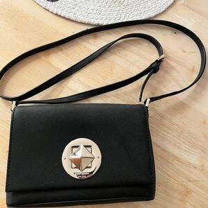 Kate Spade bag with strap. Black, dimensions are 8 x 5. Used for two events. Gold hardware.